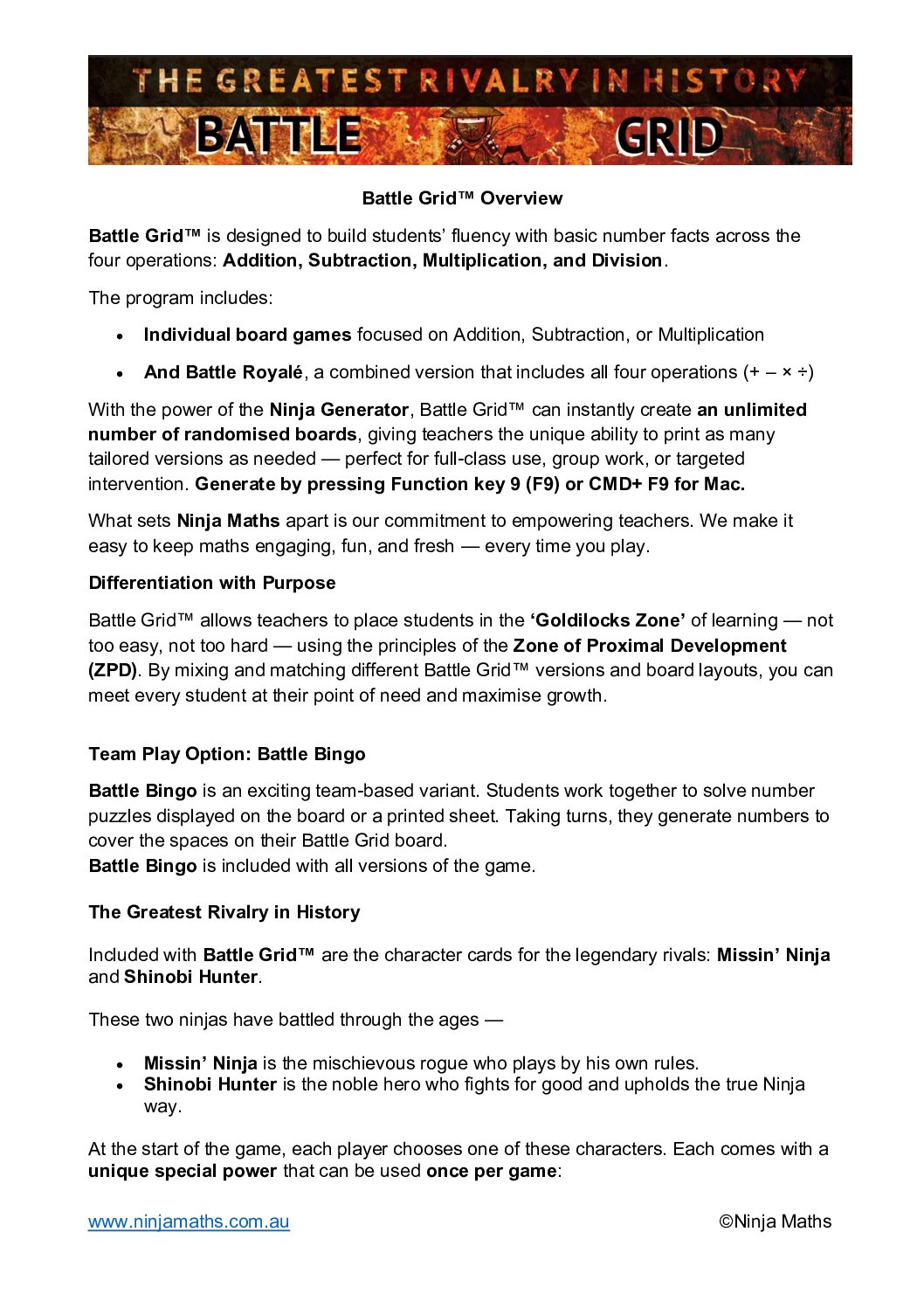 With the power of the Ninja Generator, Battle Grid™ can instantly create an unlimited number of randomised boards, giving teachers the unique ability to print as many tailored versions as needed — perfect for full-class use, group work, or targeted intervention. Generate by pressing Function key 9 (F9) or CMD+ F9 for Mac.